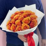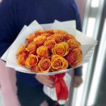 Оранжевая роза – 19 шт. Открыточка с вашими пожеланиями – 1 шт. Упаковка дизайнерская – 1 шт.