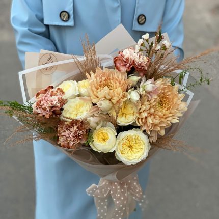 Букет из одноголовой хризантемы Аленка, пионовидных роз и гвоздики
