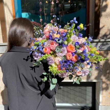 Бархатный цилиндр из голубых диантусов, розовых пионов и ароматной маттиолы