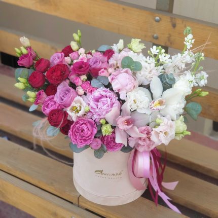 Бархатный цилиндр из голубых диантусов, розовых пионов и ароматной маттиолы