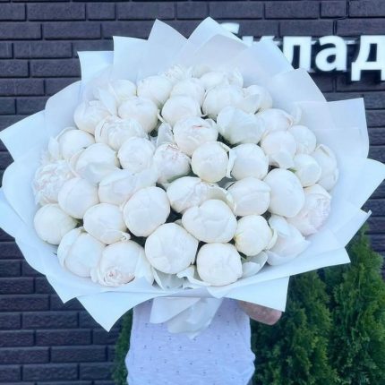Шикарный букет белых пионов 51 шт с эвкалиптом