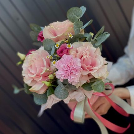 Букет Лучшее Признание S из танацетума и кустовой пионовидной розы сильвиа пинк