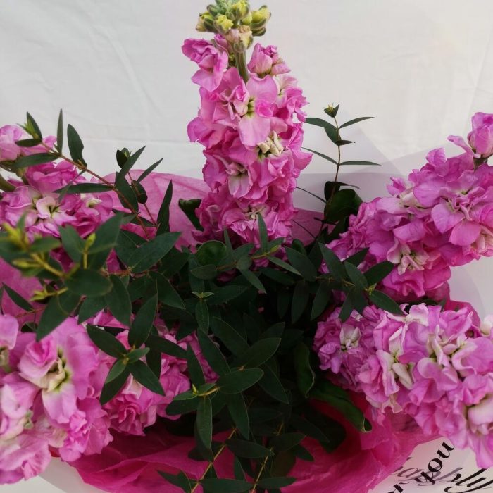 Маттиола – 5 шт.Эвкалипт – 1 шт.Лента атласная – 1 шт.Упаковка дизайнерская – 2 шт.