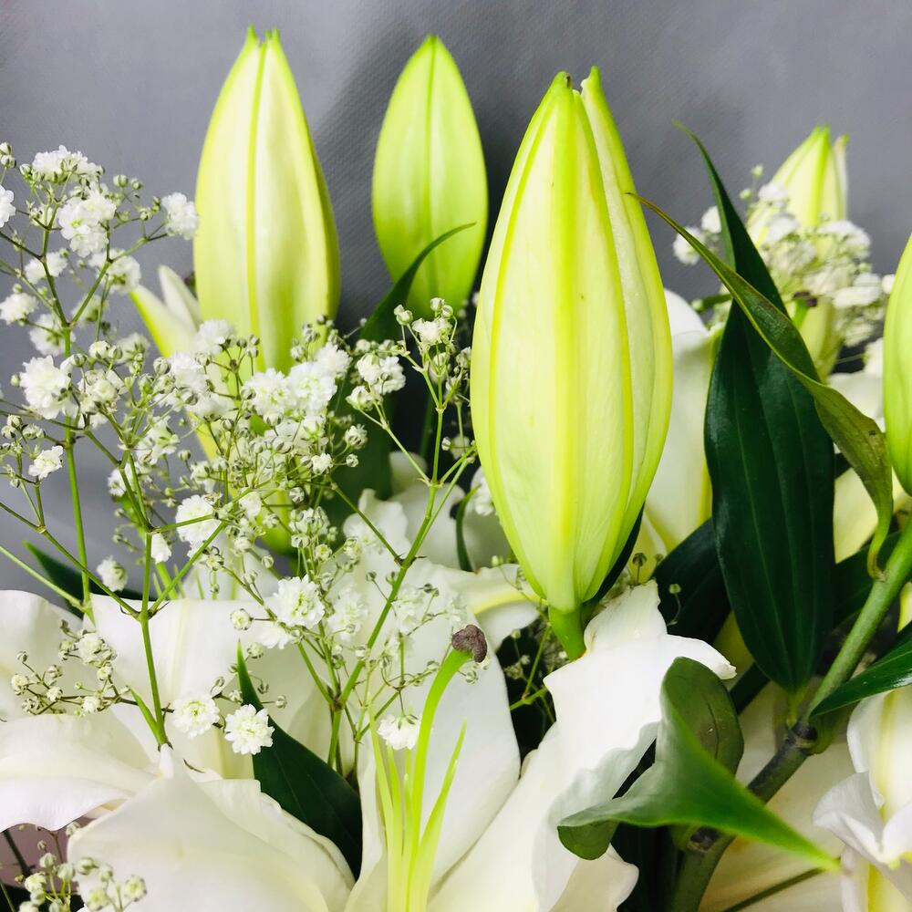Лилия белая – 3 шт.Гипсофила – 2 шт.Дизайнерская упаковка – 1 шт.