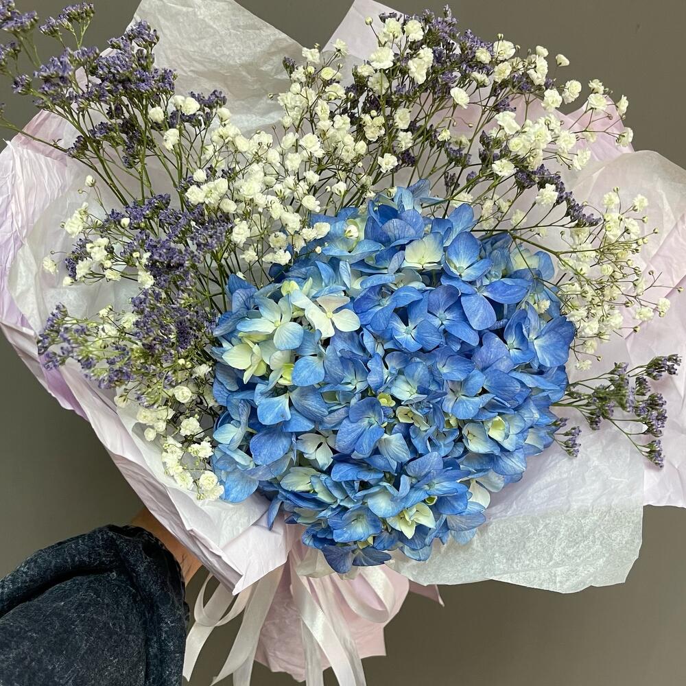 Гипсофила – 2 шт.Гортензия – 1 шт.Лимониум – 3 шт.Упаковка дизайнерская – 1 шт.