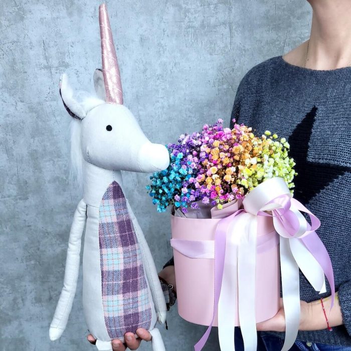 Единорог Евграф и коробочка с радужной гипсофилой