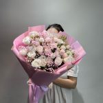 Букет из розовых гвоздик, пионовидных роз, эустом