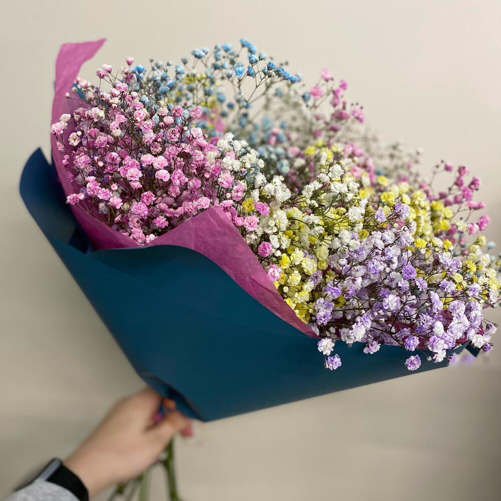 Гипсофила – 7 шт.Лента атласная – 3 шт.Тишью – 3 шт.Упаковка дизайнерская – 3 шт.