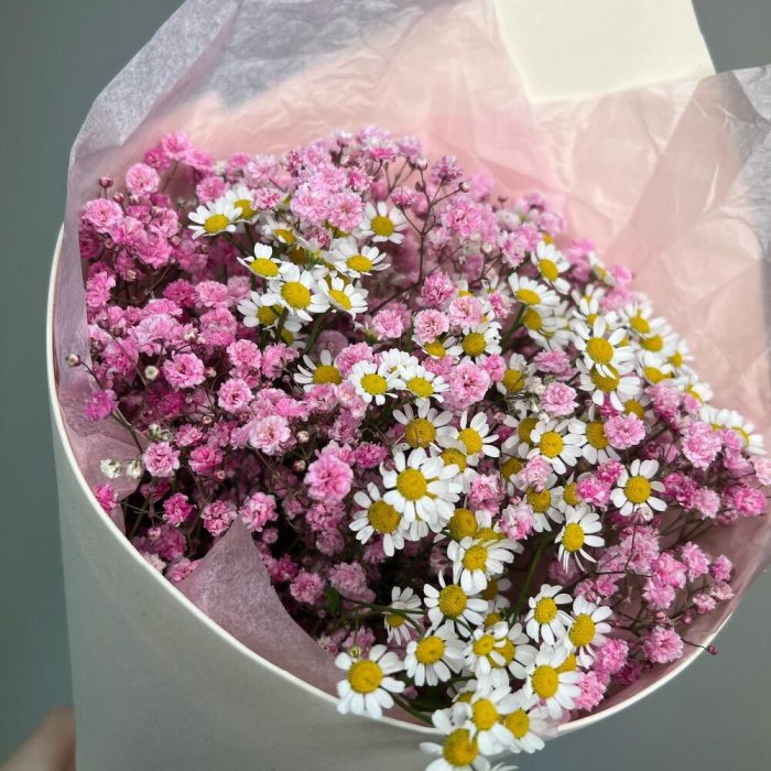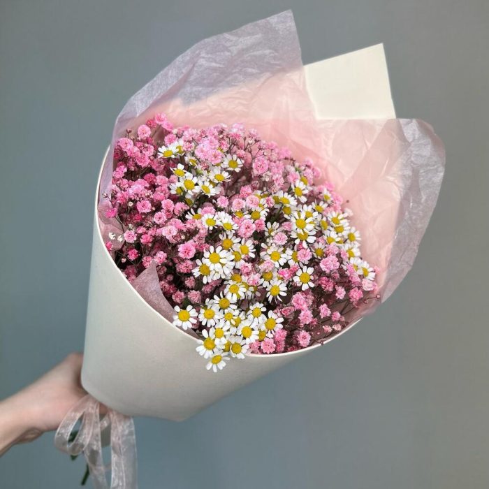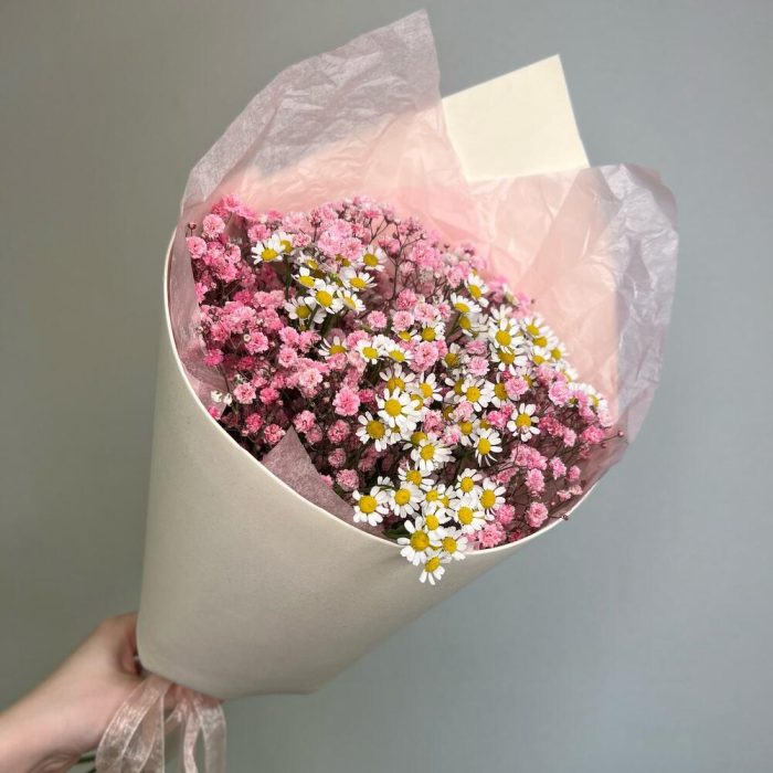 Лента атласная – 1 шт.Тишью – 1 шт.Упаковка фоамиран – 1 шт.гипсофила радужная – 4 шт.танацетум ромашка – 3 шт.