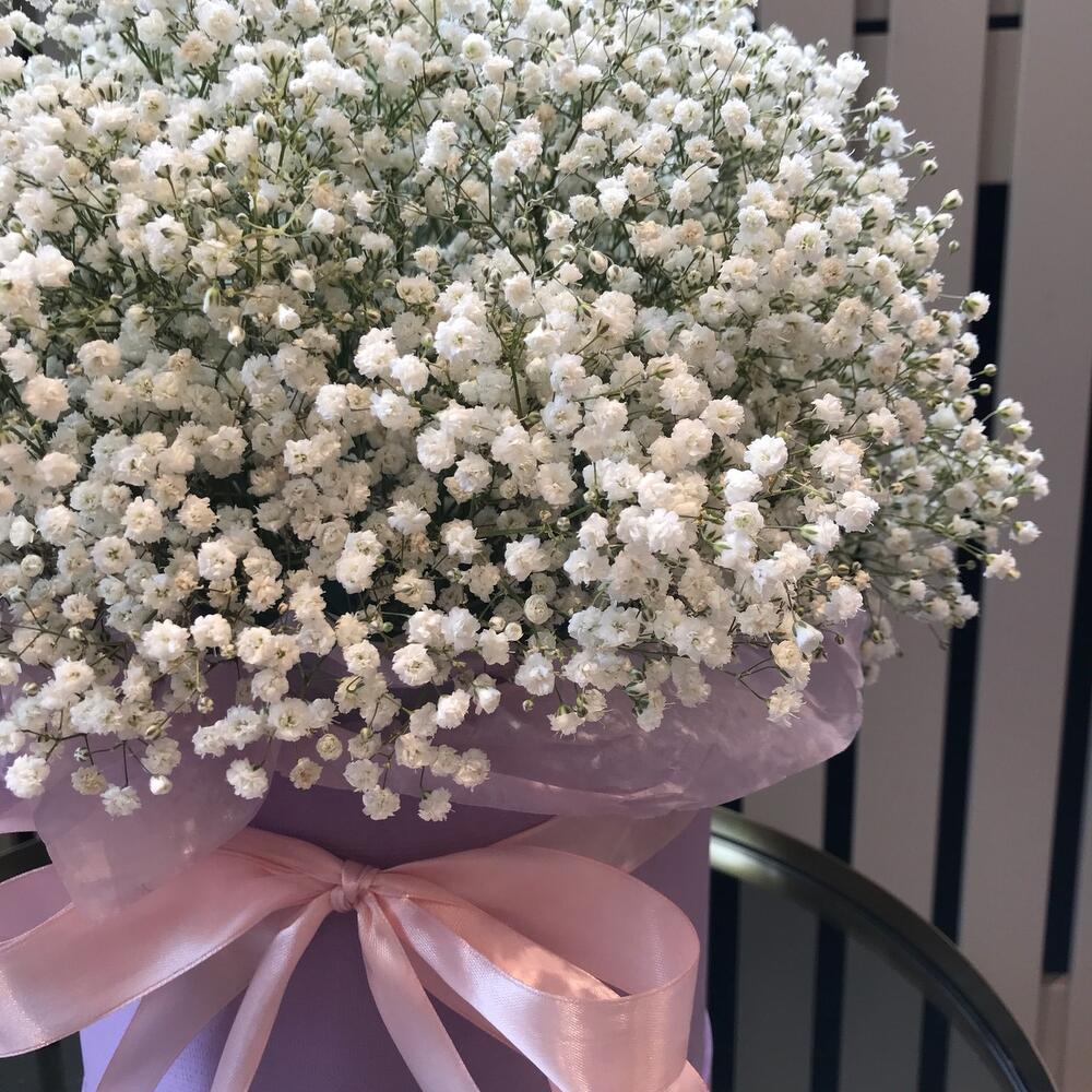 Розовая гипсофила в шляпной коробке