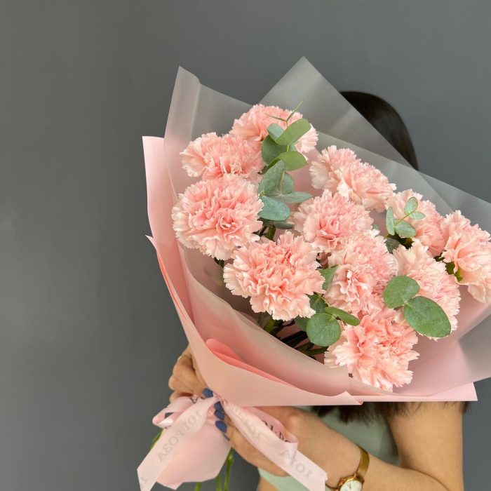 11 нежно-розовых диантусов с эвкалиптом