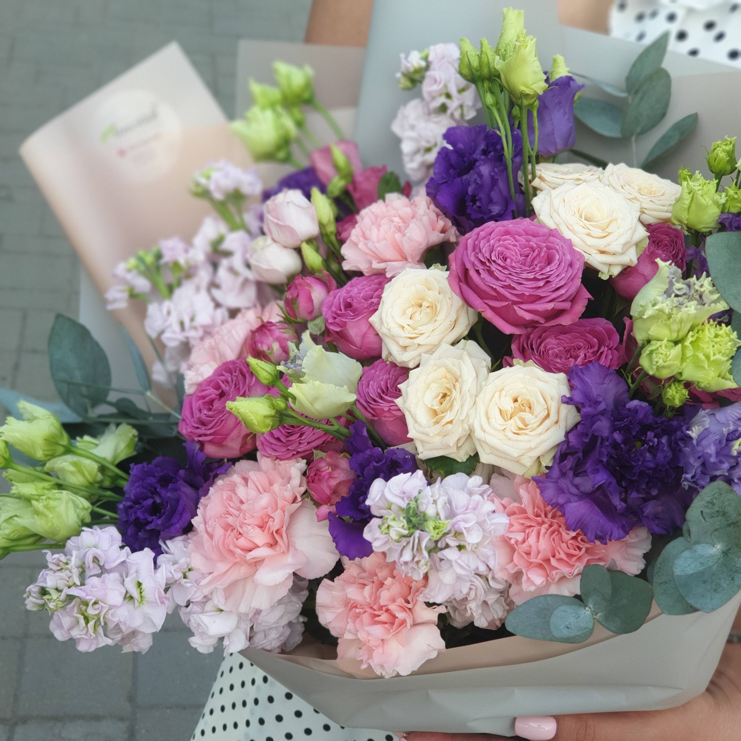 Букет из белой гвоздики, маттиолы и кустовых роз