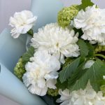 Хризантема Антонов – 3 шт.Вибурнум – 2 шт.Подсолнух – 1 шт.Диантус – 4 шт.Пленка дизайнерская – 1 шт.Лента – 1 шт.