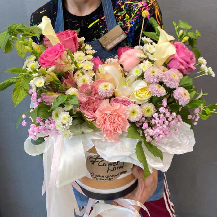 Альстромерия – 2 шт.Гипсофила – 1 шт.Хлопок – 2 шт.Зелень – 5 шт.Диантус – 1 шт.Сантини – 5 шт.каалы – 4 шт.розы микс – 6 шт.