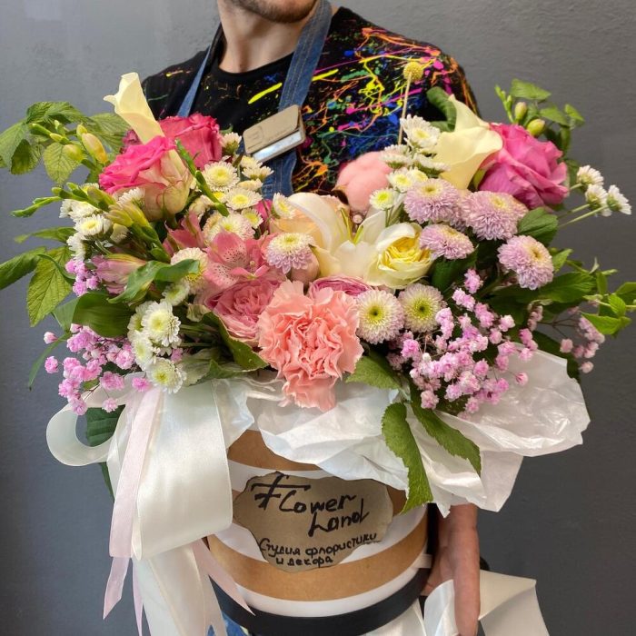 “Атлас☁️” – цветочная композиция с зефиром в деревянном ящике