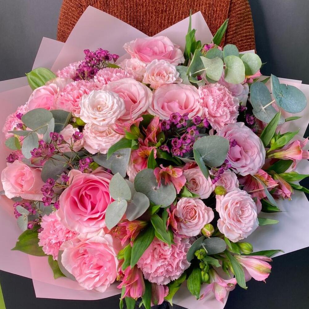Гвоздики, Лизиантусы, Розы, Тюльпаны