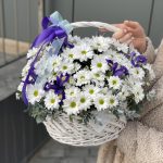 Корзина – 1 шт. Писташ – 6 шт. Хризантема – 11 шт. Оазис – 2 шт. Оформление – 1 шт. ирисы – 9 шт.