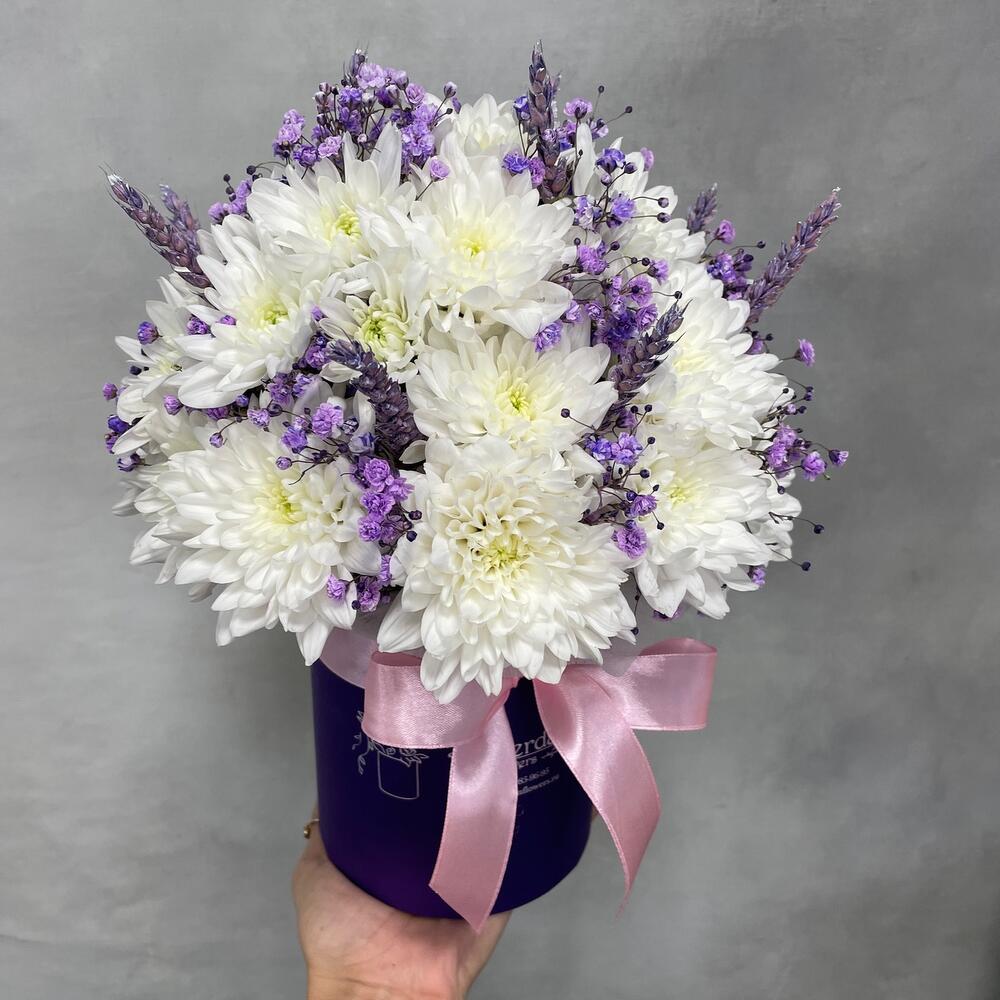 Коробка d12 – 1 шт.Оазис – 1 шт.Хризантема кустовая – 5 шт.Гипсофила фиолетовая – 2 шт.Пшеница (сухоцвет) – 9 шт.
