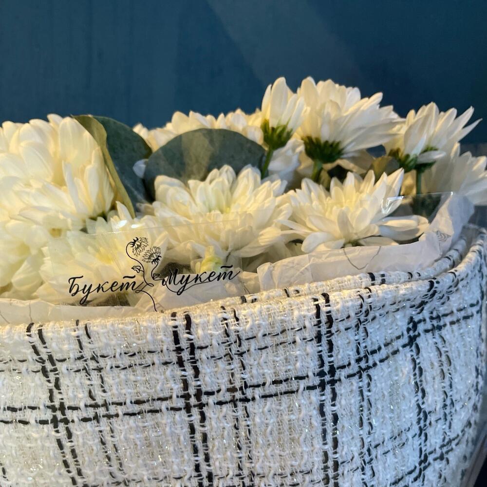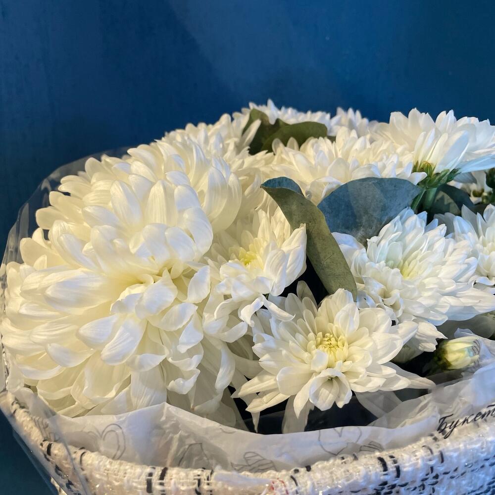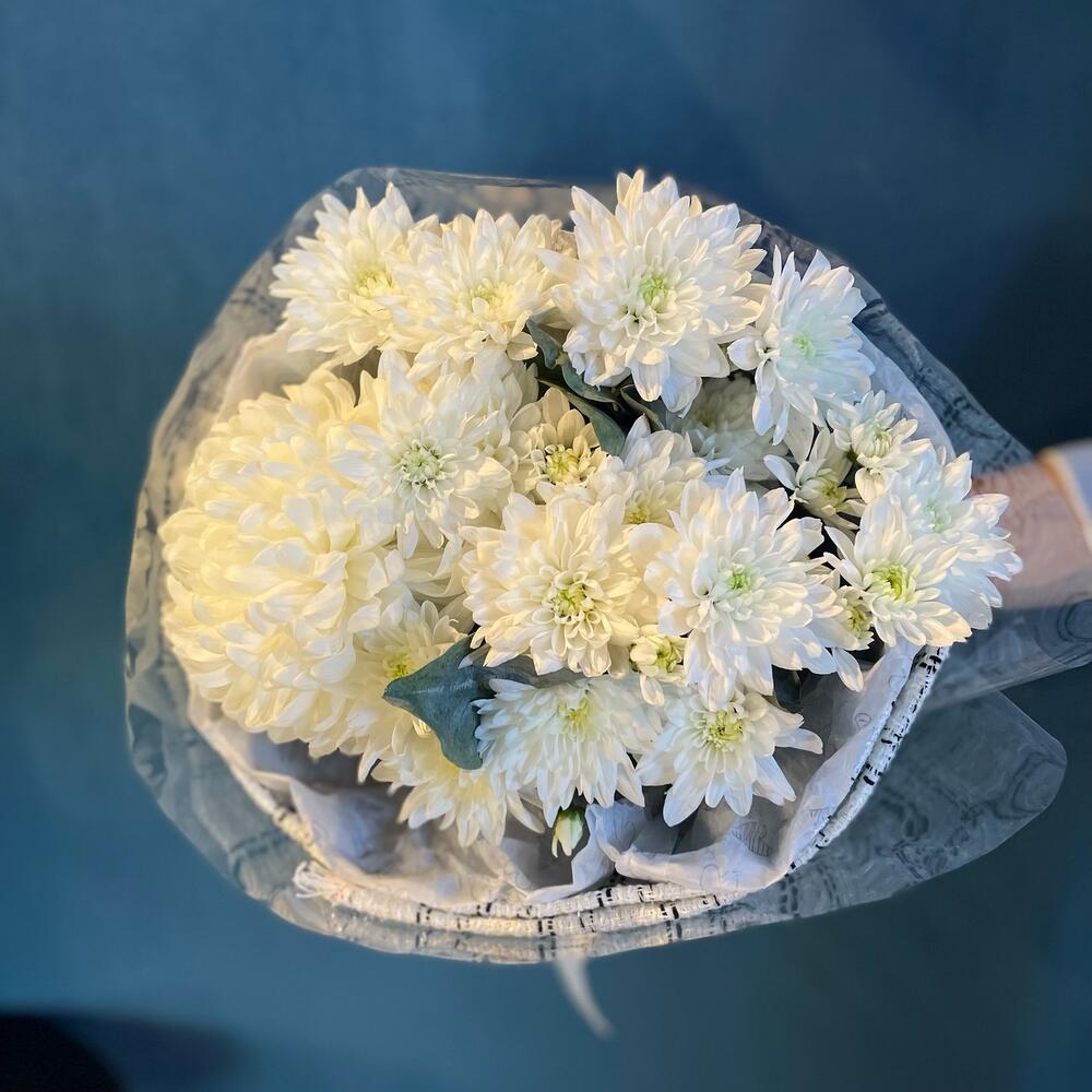 Хризантема Антонов – 1 шт.Хризантема Балтика – 5 шт.Эвкалипт – 1 шт.Ткань – 1 шт.Тишью – 2 шт.Пленка прозрачная – 1 шт.Лента атласная – 1 шт.
