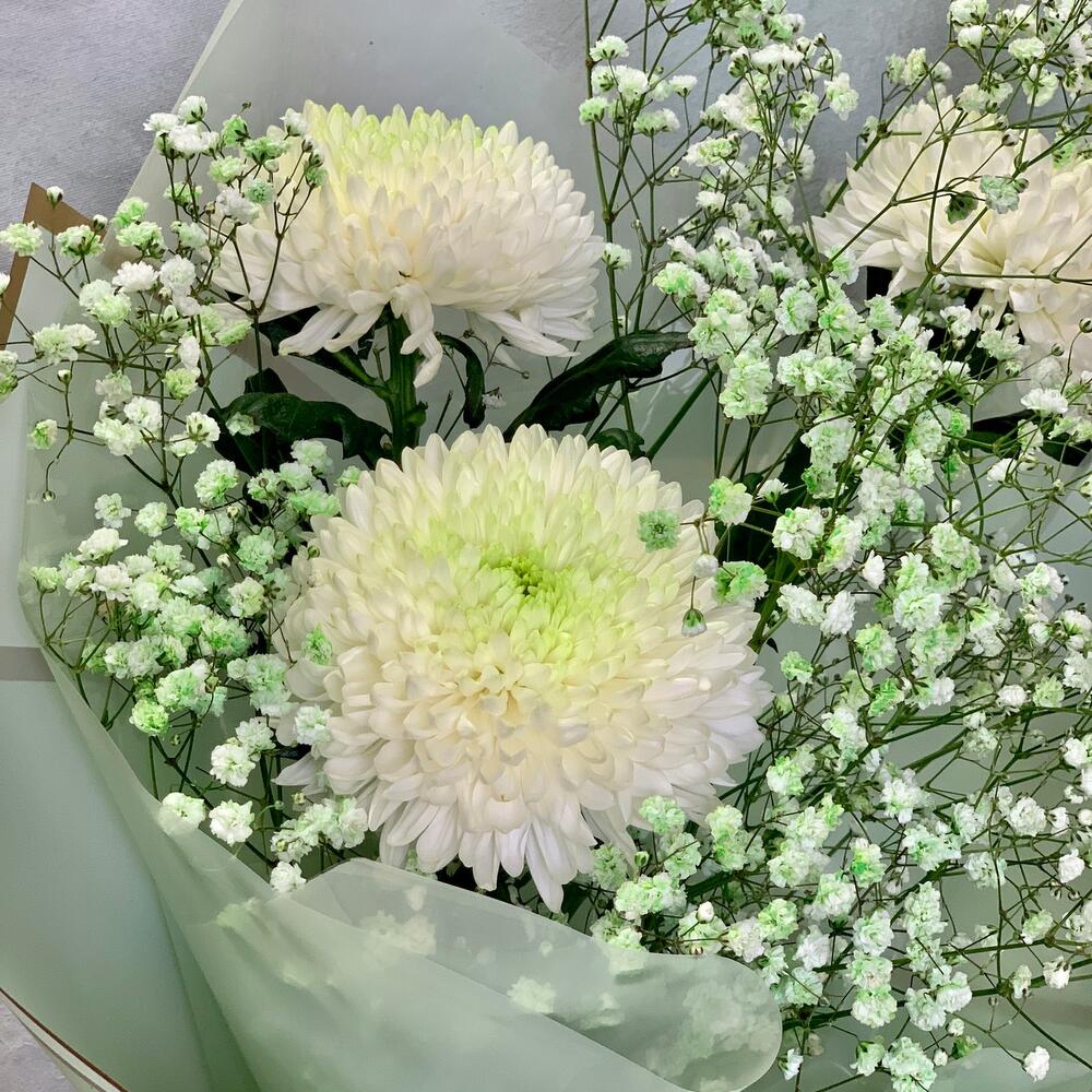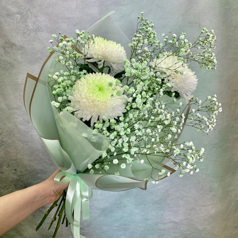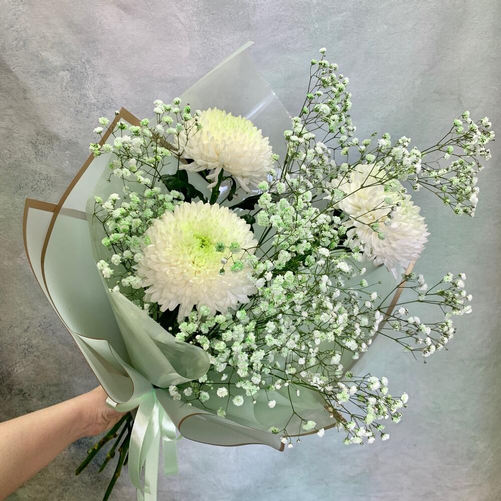 Воздушный букет из хризантем и гипсофилы