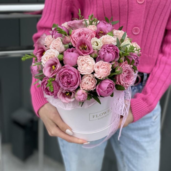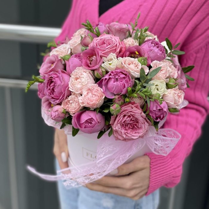 Коробка Трогательные чувства из эустомы и пионовидных роз