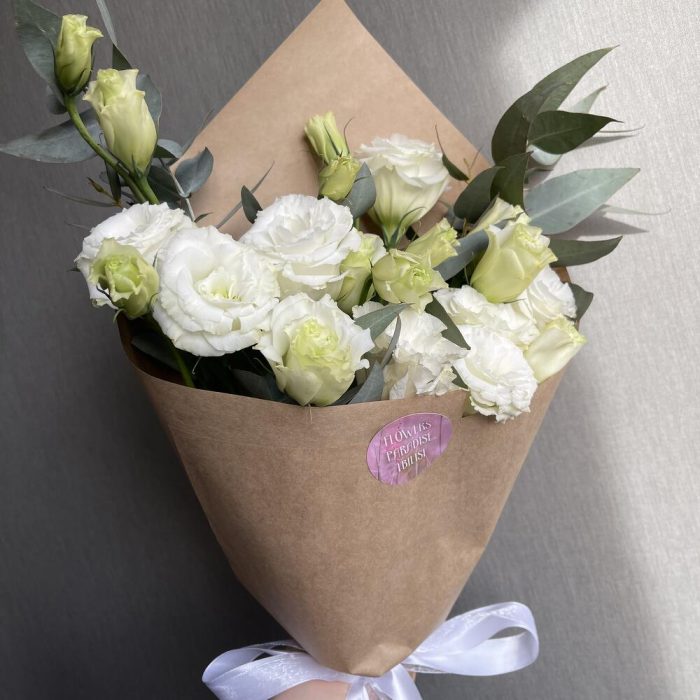 Монобукет из эустомы в крафте – это прекрасный выбор для тех, кто ценит красоту и натуральность цветов.