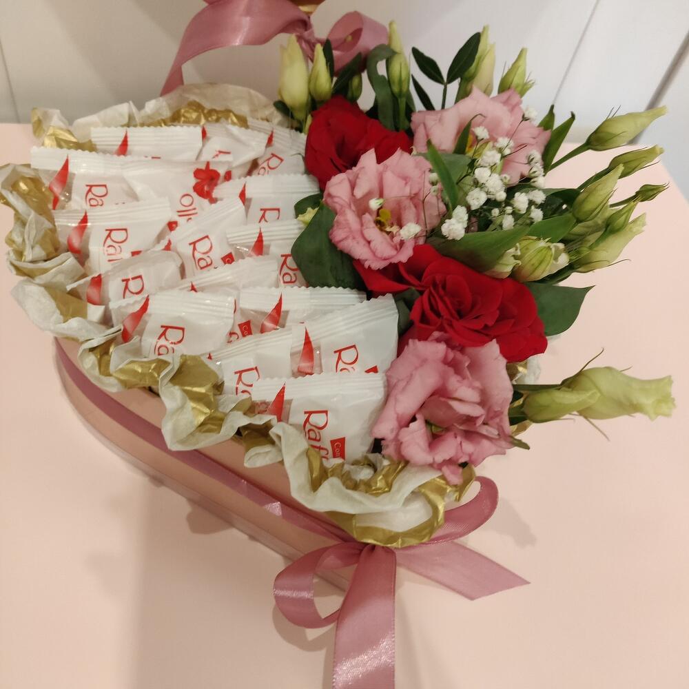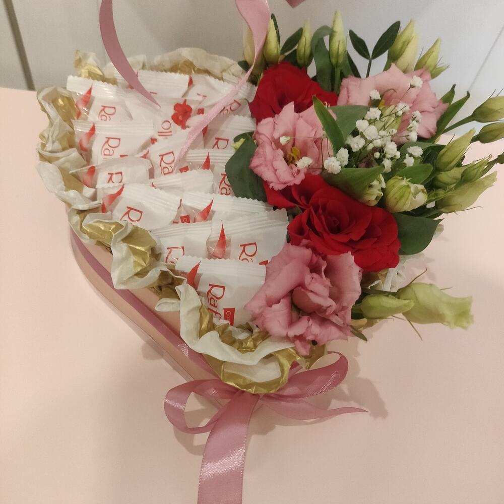 “Сладкое сердце ” – цветочная композиция с сладостями в коробке “Сердце”