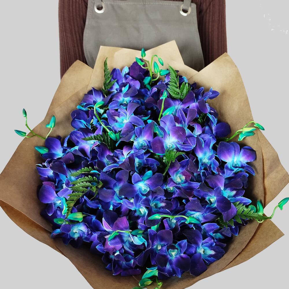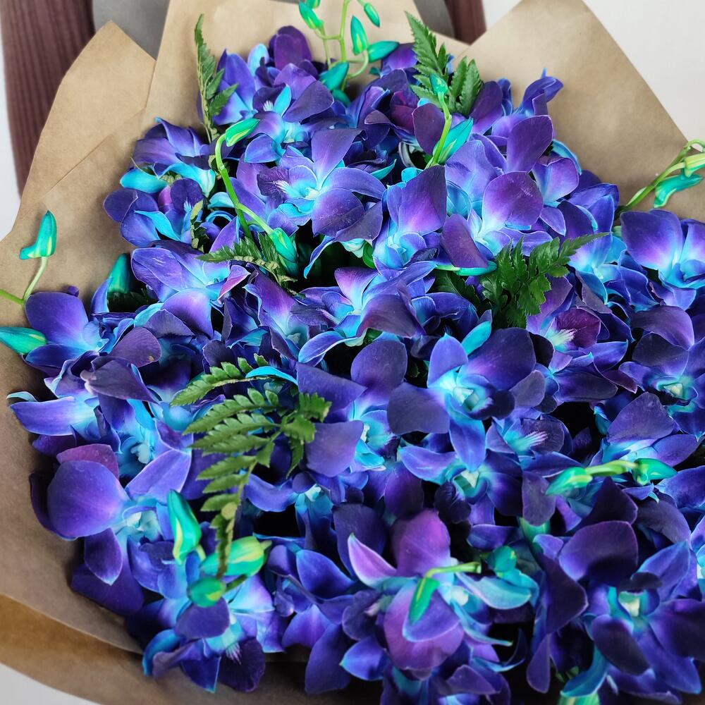 орхидея дендробиум синяя цветочки – 101 шт.папоротник ветка – 2 шт.Крафт упаковка – 5 шт.удлинитель для орхидеи – 51 шт.любовь флориста (бесплатно) – 1 шт.инструкция по уходу за цветами – 1 шт.подкормка для срезанных цветов – 1 шт.