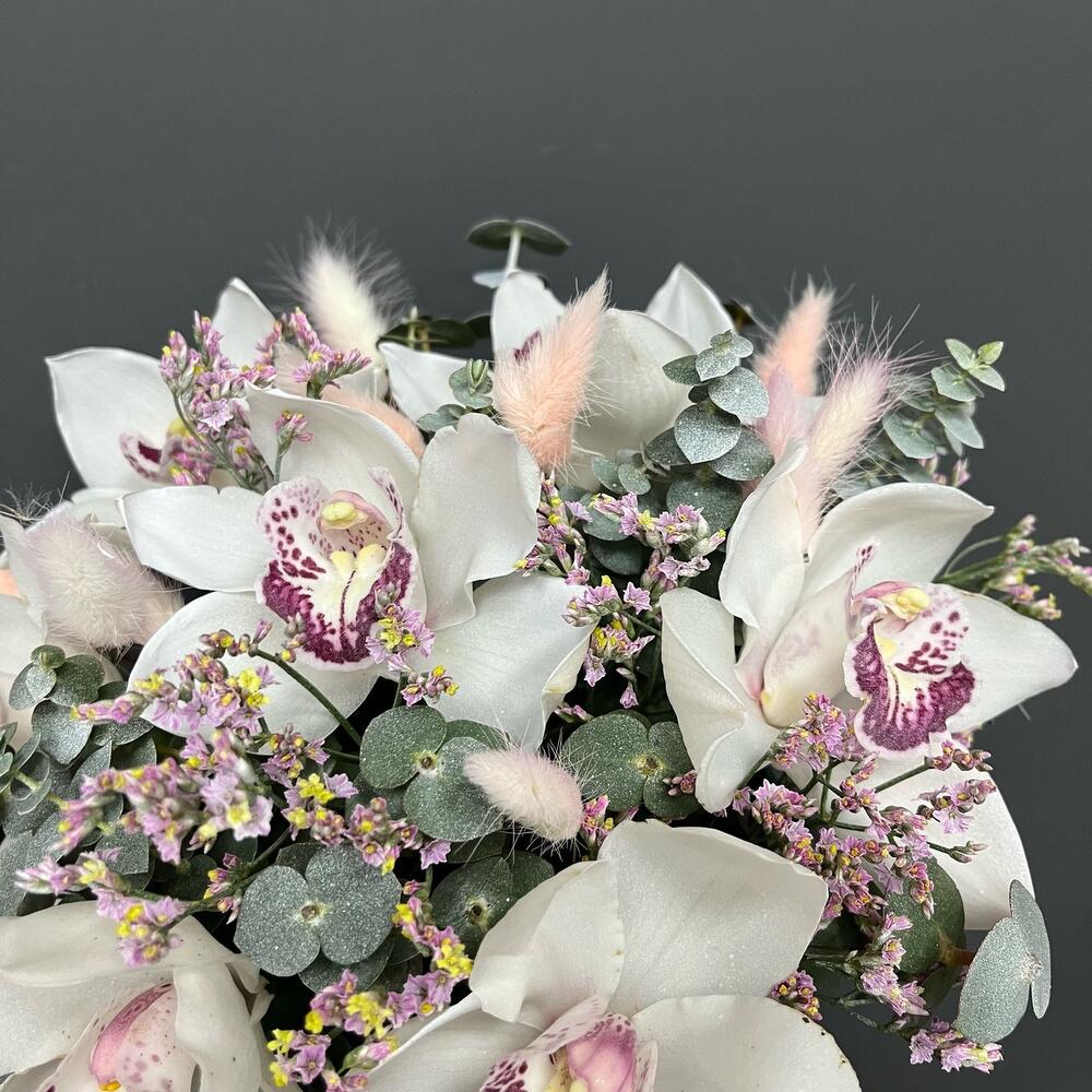 Эвкалипт – 5 шт.Лимониум розовый – 3 шт.Оазис флористический – 1 шт.удлинитель для орхидея – 7 шт.орхидея премиум цимбидиум – 7 шт.шляпная коробка нюдовая – 1 шт.