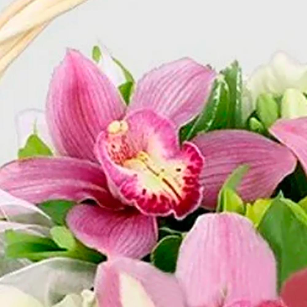 Орхидея цимбидиум бутон – 3 шт.Фрезия – 10 шт.Зелень – 10 шт.Декор флористический – 7 шт.Корзина – 1 шт.Пиафлор (оазис) – 2 шт.
