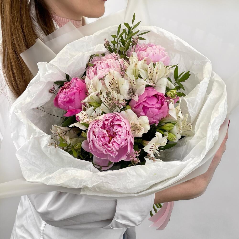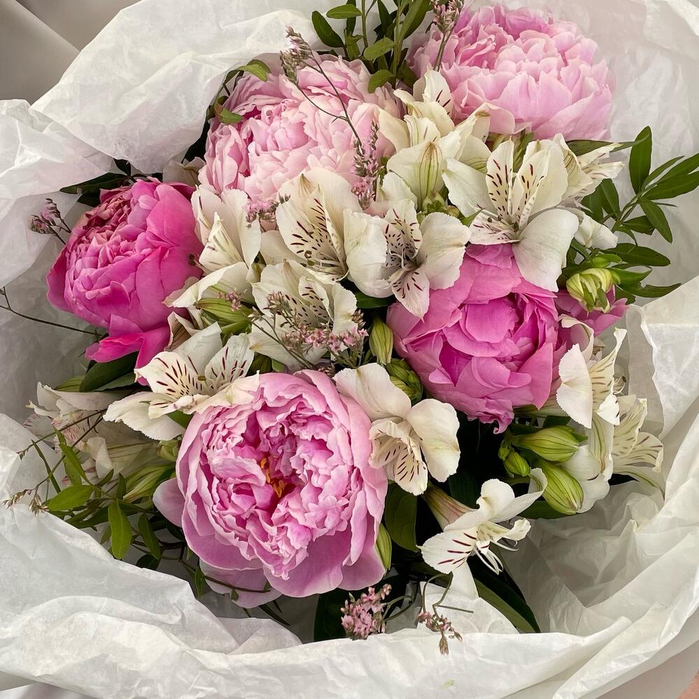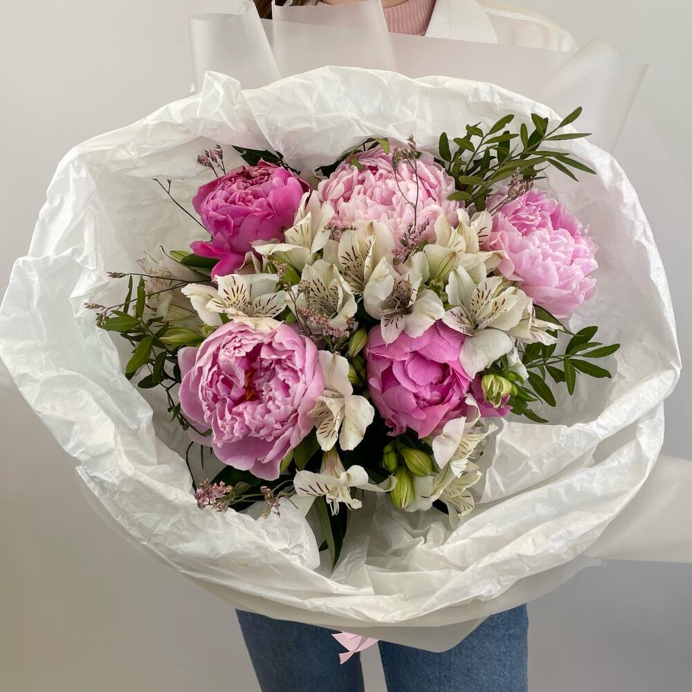 Пион – 5 шт.Альстромерия – 4 шт.Лимониум – 1 шт.Фисташка – 1 шт.Тишью – 3 шт.Упаковка дизайнерская – 1 шт.Лента атласная – 1 шт.