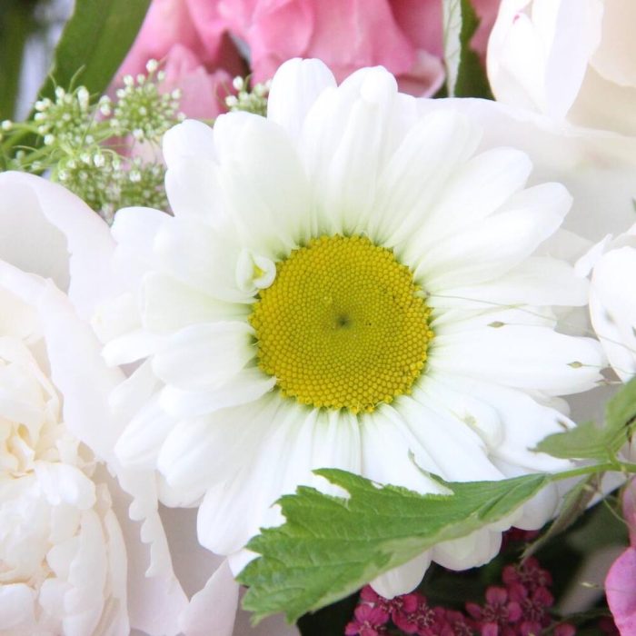 Пион – 3 шт.Колокольчик – 2 шт.Ромашка – 3 шт.Астра – 2 шт.львиный – 3 шт.Маттиола – 2 шт.Ахиллея – 2 шт.Паникум – 3 шт.Ветки малины – 4 шт.Фисташка – 2 шт.Лента атласная – 1 шт.