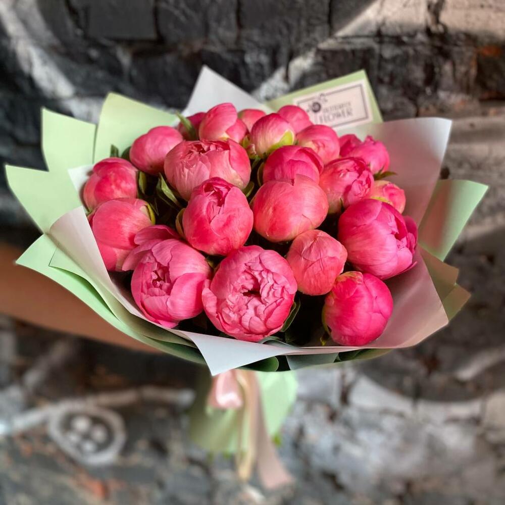 Букет из 21 кораллового пиона в дизайнерской упаковке “Коралл Саншайн”
