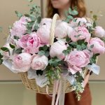 Пион Сара Бернар розовый – 19 шт.Корзина плетеная – 1 шт.Эвкалипт пучок – 2 шт.Лента брендированная – 1 шт.Оазис флористический – 2 шт.Тишью белое – 4 шт.лента силиконовая брендированная – 1 шт.