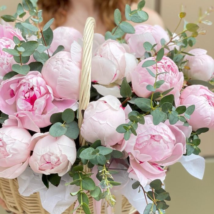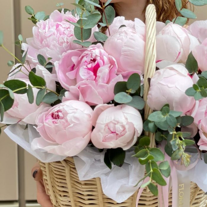 Пион Сара Бернар розовый – 19 шт.Корзина плетеная – 1 шт.Эвкалипт пучок – 2 шт.Лента брендированная – 1 шт.Оазис флористический – 2 шт.Тишью белое – 4 шт.лента силиконовая брендированная – 1 шт.