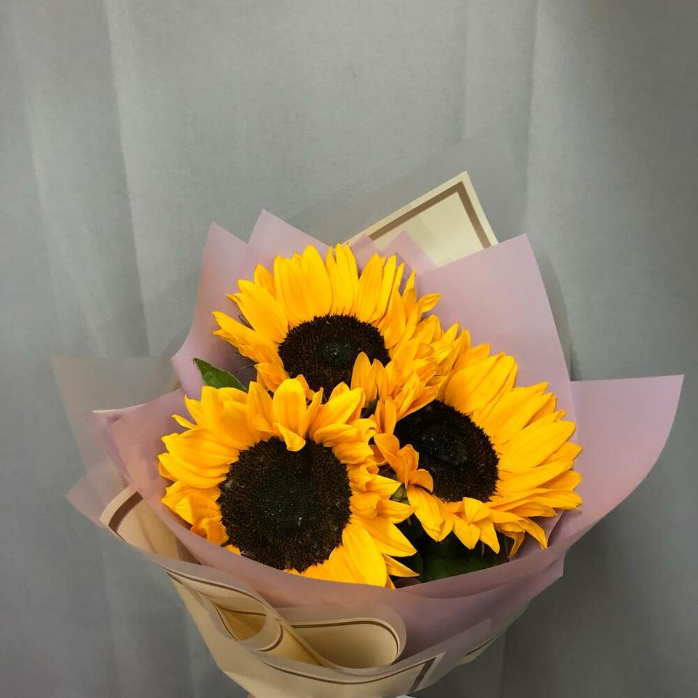 Подсолнух – 3 шт.Корейская пленка – 3 шт.Атласная лента – 1 шт.
