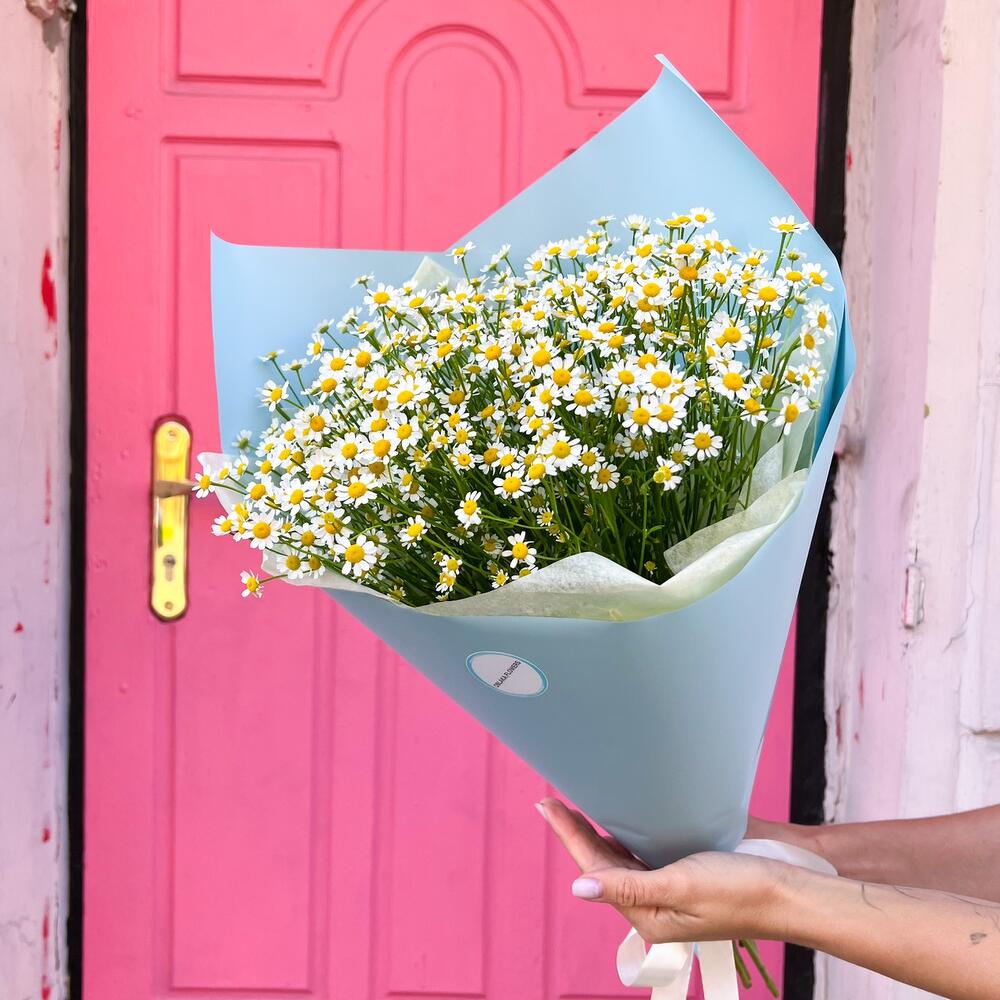 Лента атласная – 1 шт.Тишью – 2 шт.Аквапак – 1 шт.Матрикария (Ромашка Камила) – 15 шт.Корейская пленка – 3 шт.