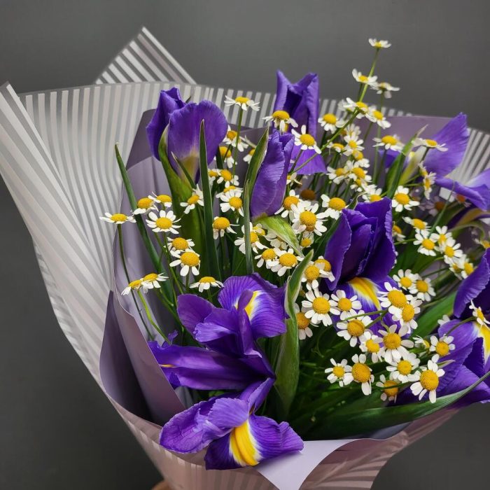 Букет с ирисами и ромашками