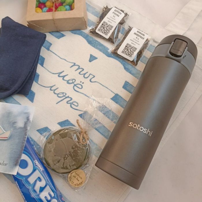 сумка шоппер – 1 шт.термос 500мл – 1 шт.морские камешки – 1 шт.Черный чай – 2 шт.мыло ромашковое – 1 шт.Орео – 1 шт.брошь керамическая ручной работы – 1 шт.носки шерстяные – 1 шт.Блокнот – 1 шт.Подарочная упаковка – 1 шт.