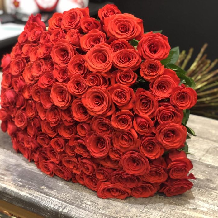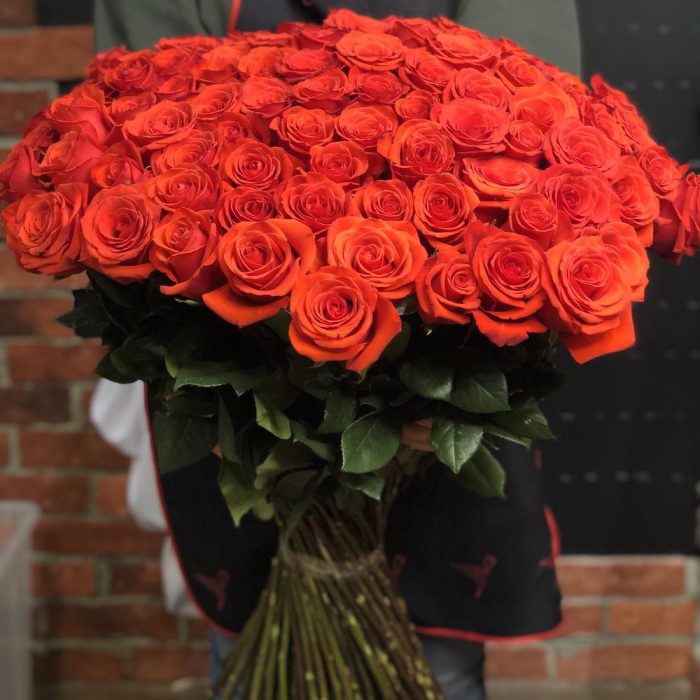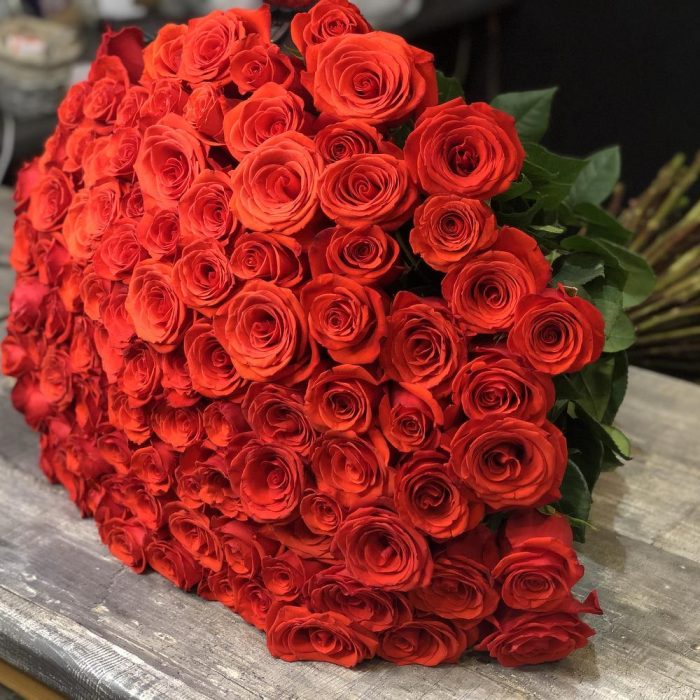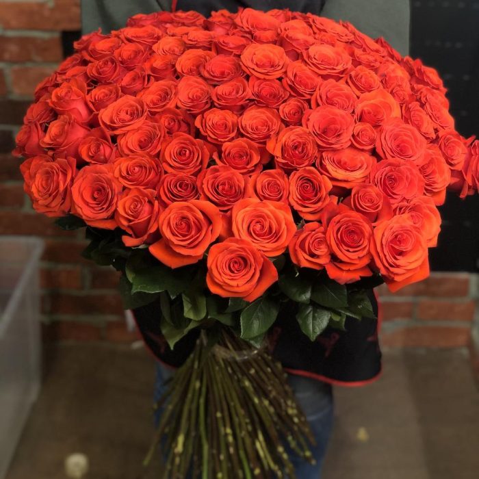 Красная роза эквадор – 101 шт.Пленка прозрачная – 1 шт.Лента атласная – 1 шт.