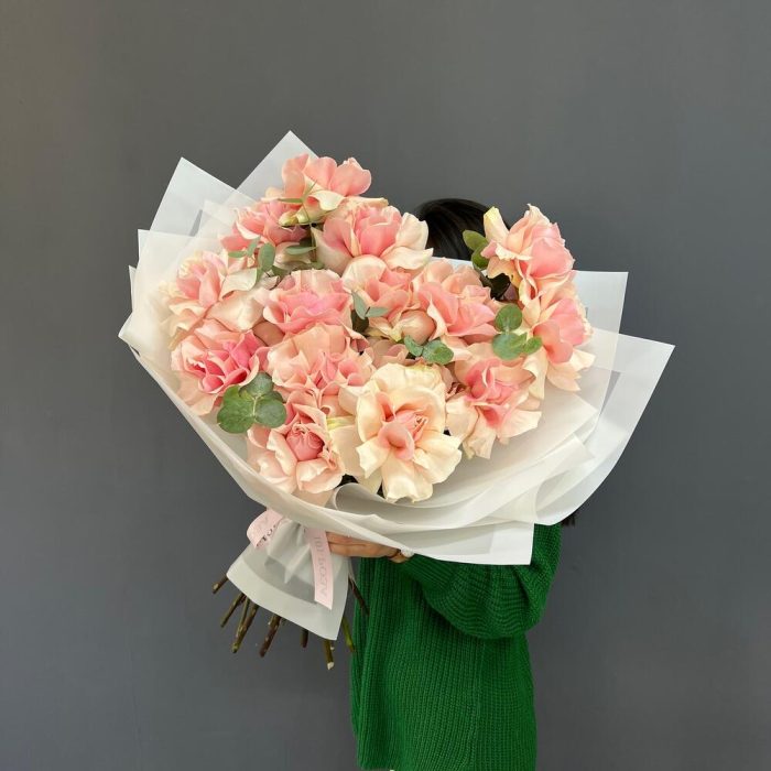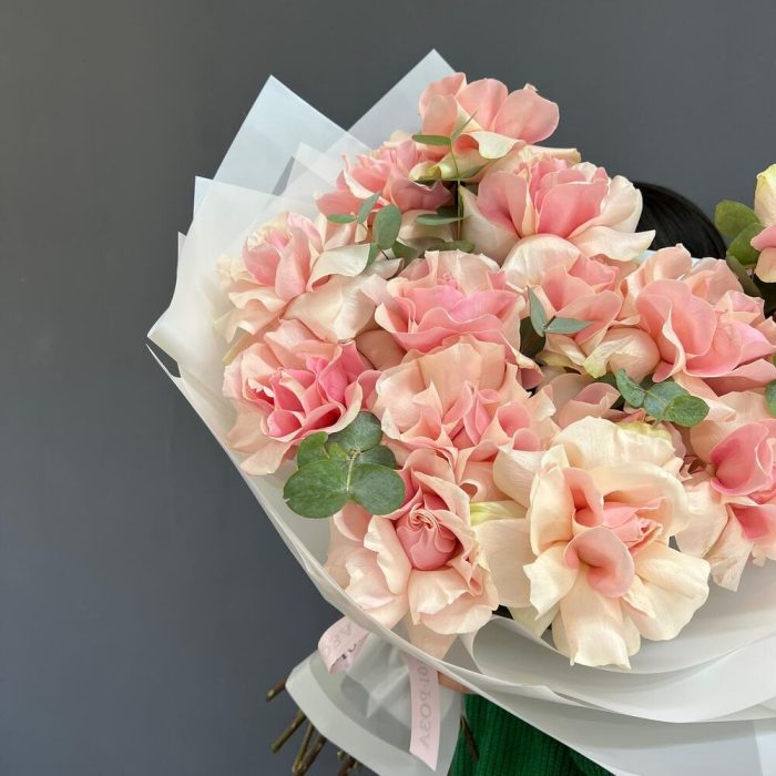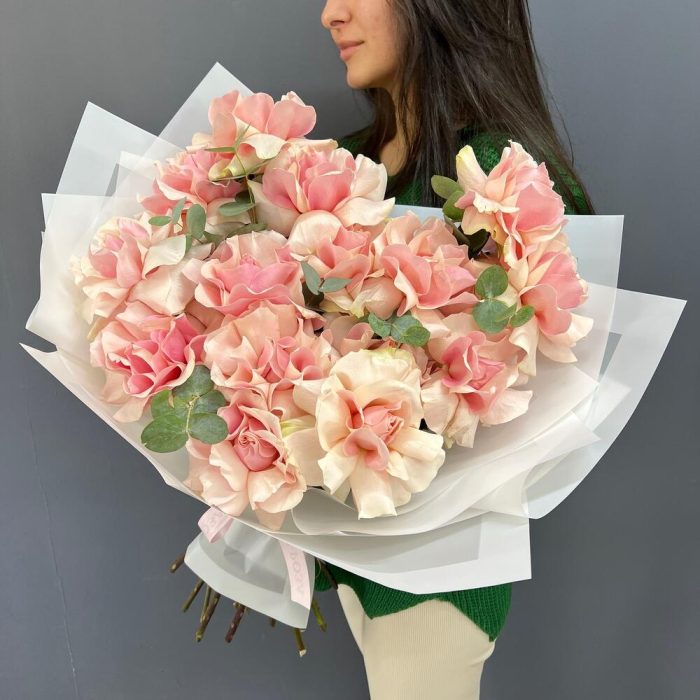Эвкалипт – 7 шт.Атласная лента – 1 шт.Французская роза – 15 шт.Дизайнерская упаковка – 1 шт.