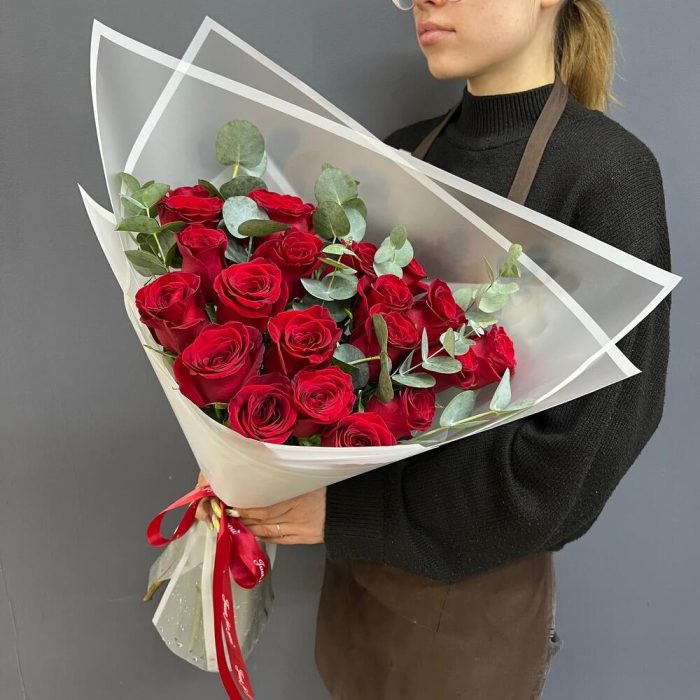 21 красная роза с эвкалиптом