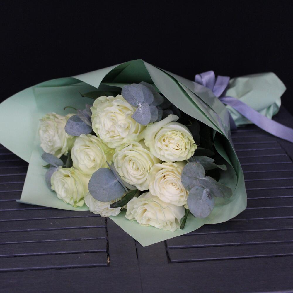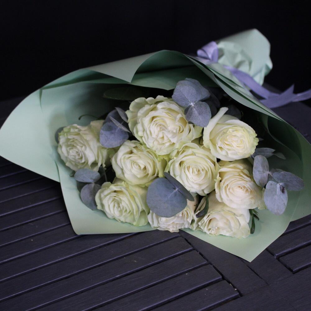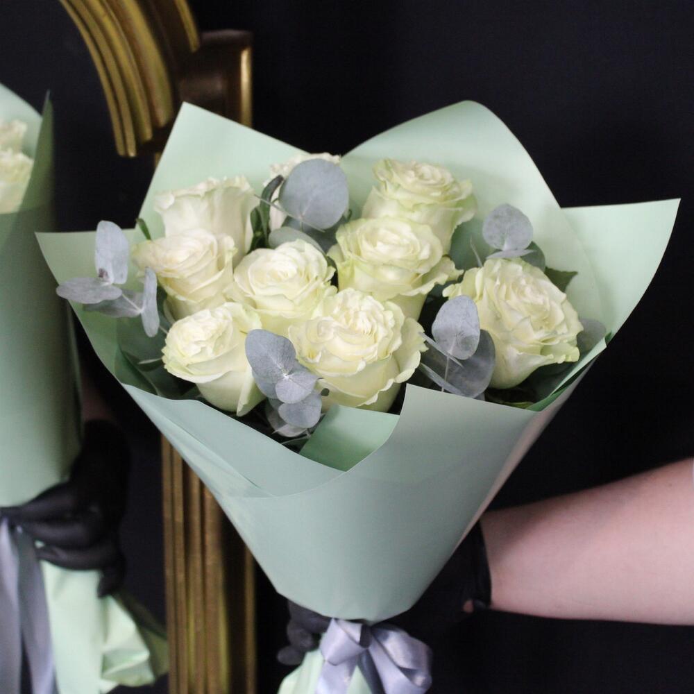 9 роз сорта mondial с эвкалиптом