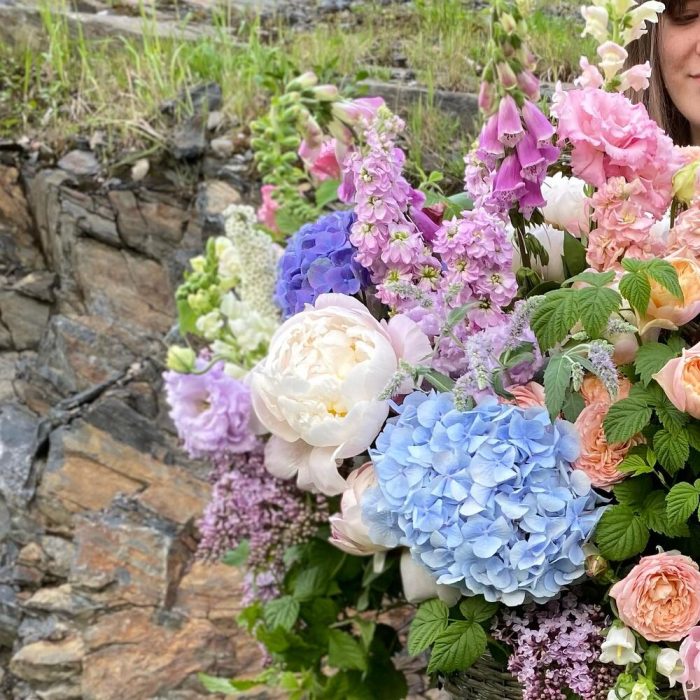 Гортензия – 5 шт.Пион – 9 шт.Роза пионовидная – 7 шт.Колокольчик – 3 шт.матиолы – 13 шт.Лизиантус – 9 шт.Наперстянка – 6 шт.Львиный зев – 7 шт.Сирень – 11 шт.Малина – 15 шт.Травы – 7 шт.Оазис флористический – 4 шт.Корзина – 1 шт.