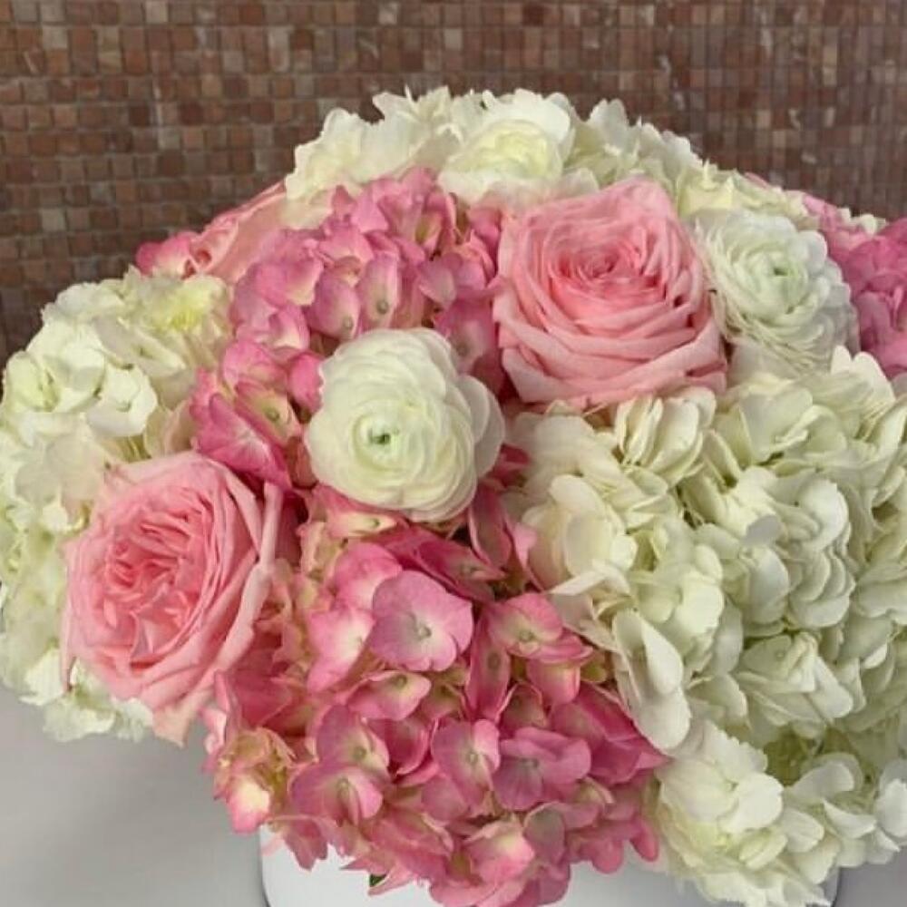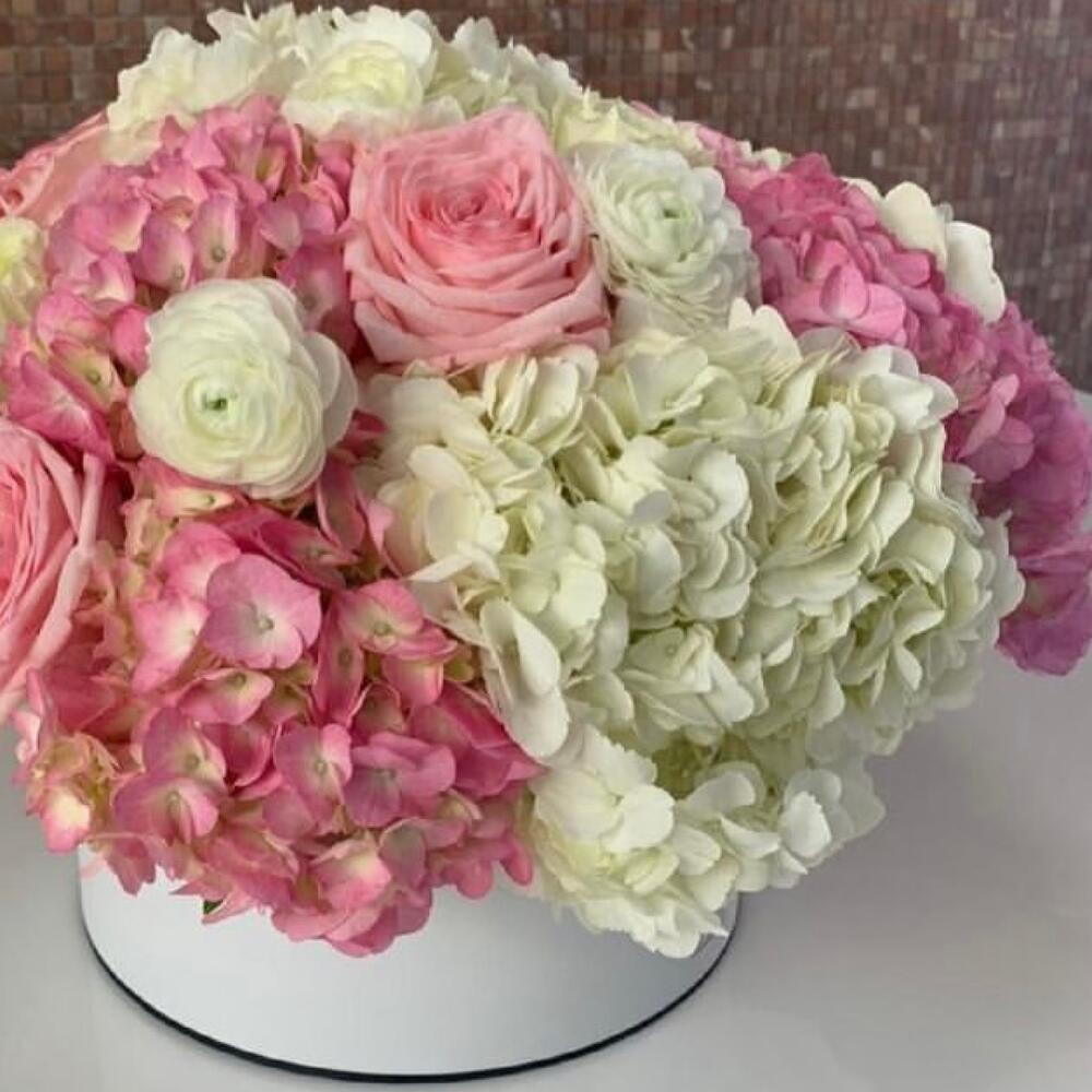 Авторская композиция из гортензий, роз и ранункулюсов в шляпной коробке
