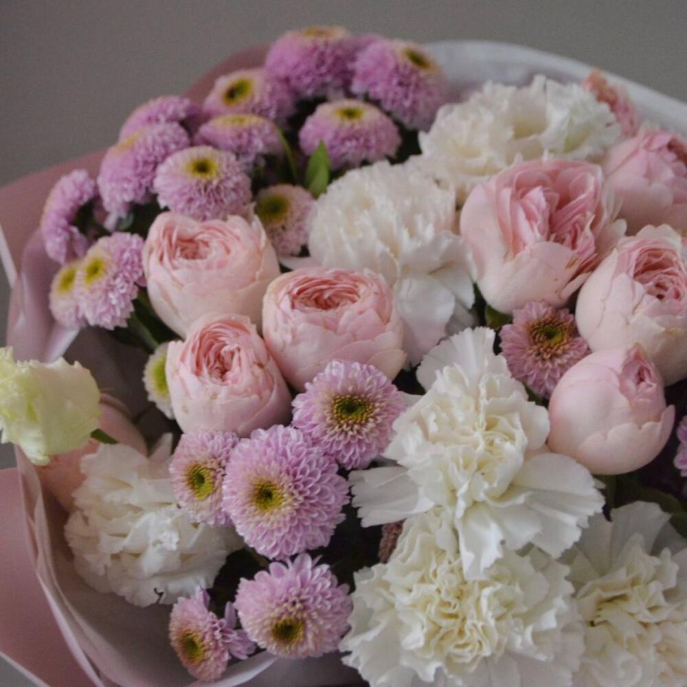 Гвоздики, Кустовые розы, Пионовидные розы, Розы