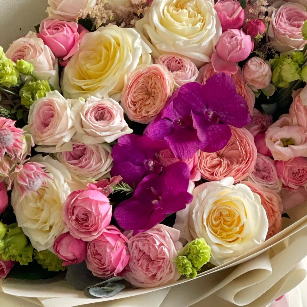 Альстромерии, Кустовые розы, Лизиантусы, Пионовидные розы, Розы, Ромашки