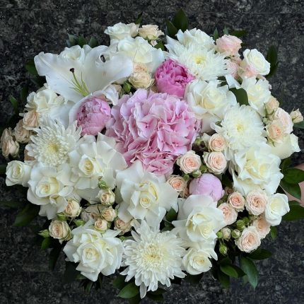 Гортензия – 1 шт. Роза – 13 шт. Спрей роза – 11 шт. Хризантема – 10 шт. Рускус – 5 шт. бумага дизайнерская – 1 шт.