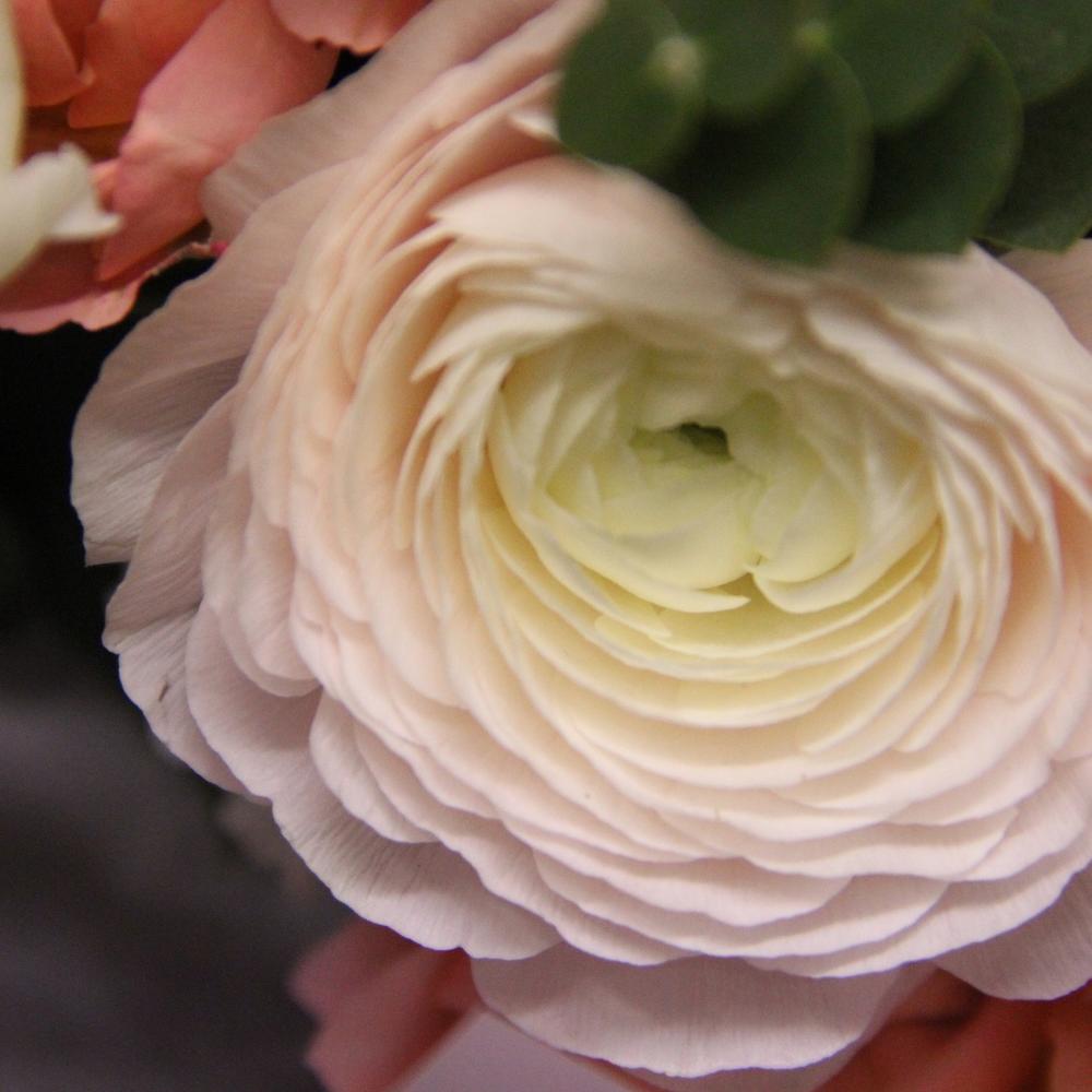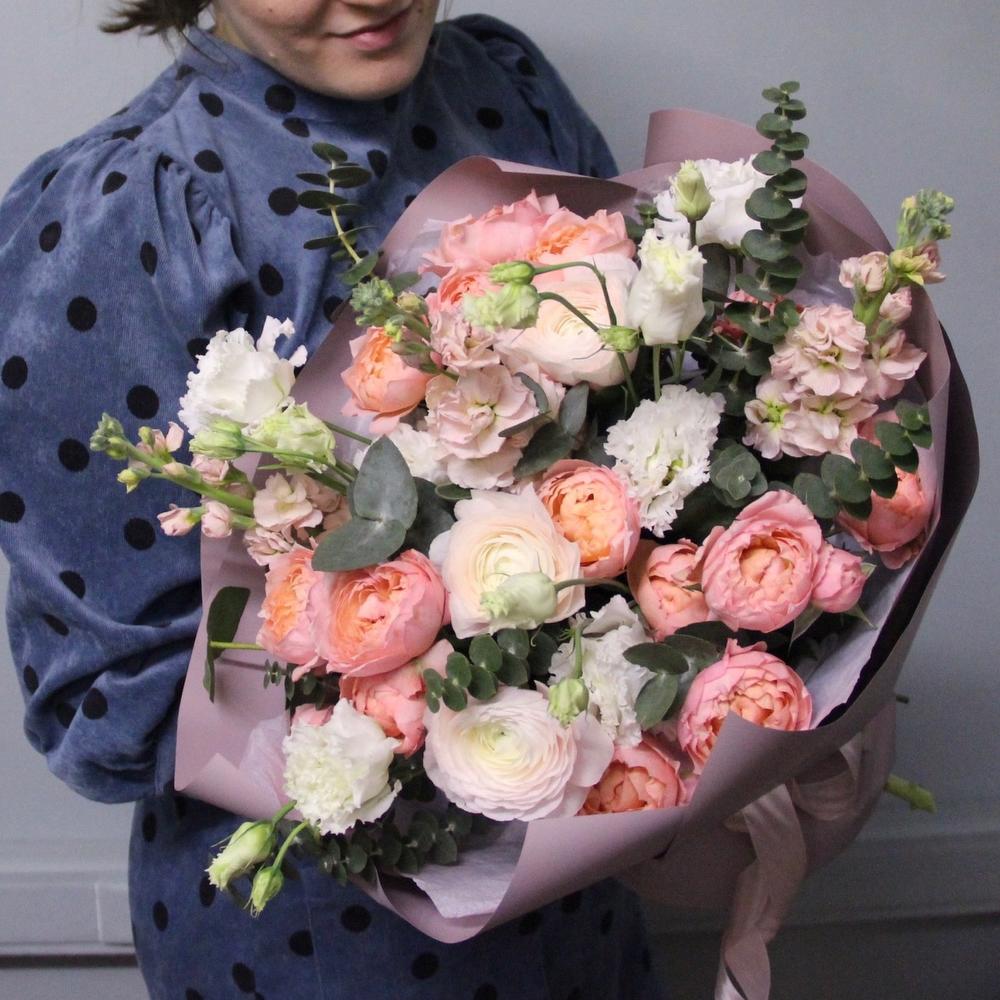 Ранункулюс – 3 шт.Роза кустовая пионовидная – 2 шт.Маттиола – 3 шт.Лизиантус – 2 шт.Эвкалипт – 5 шт.Тишью – 2 шт.Бумага – 2 шт.Лента – 1 шт.