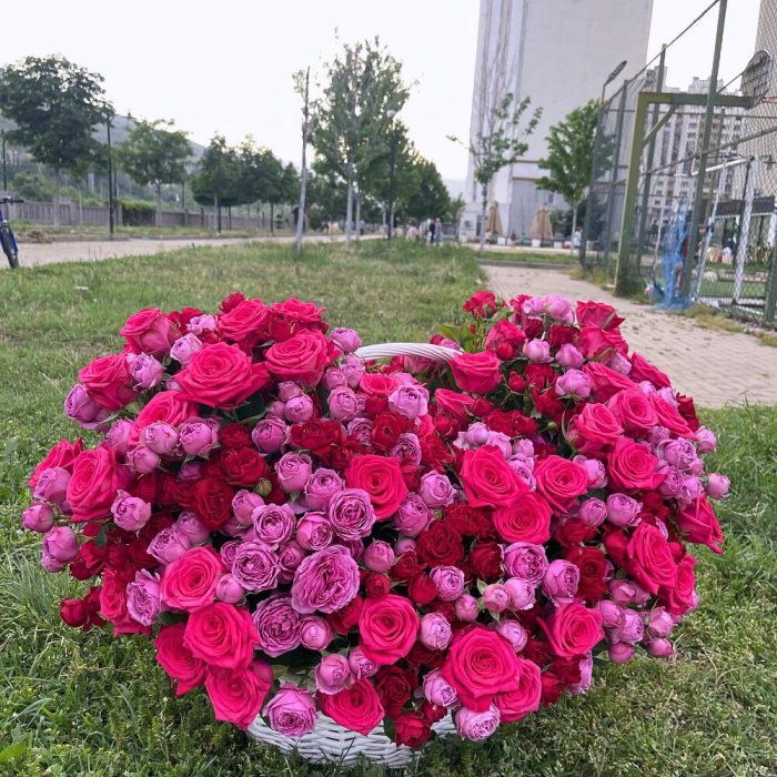 Добро пожаловать в мир роскошных цветов! Представляем вам нашу великолепную большую корзину с розами. Наша композиция состоит из более чем 200 роз, включая кустовые и одноголовые сорта.